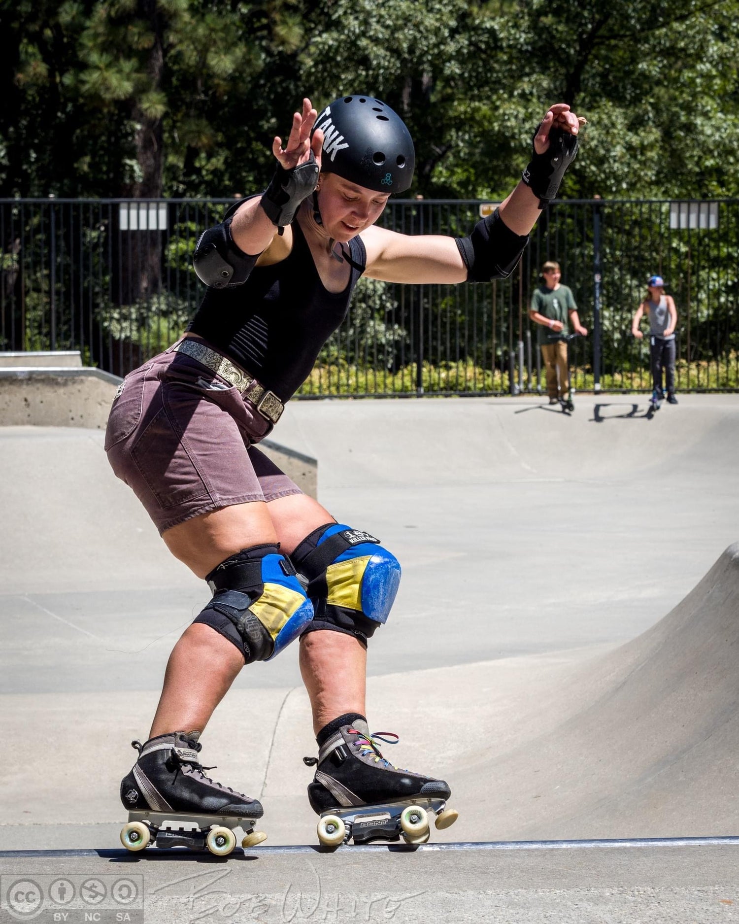 Devon, also known as Tank, loves skate park skating in her quads and playing roller derby for the Outlaws. She grew up in Nevada County, and while she found skating later in her life it has become an important part of who she is. Devon is proud to serve as a member of NCS as a way to build, serve and improve her local community and access to skating for all ages and all wheels.